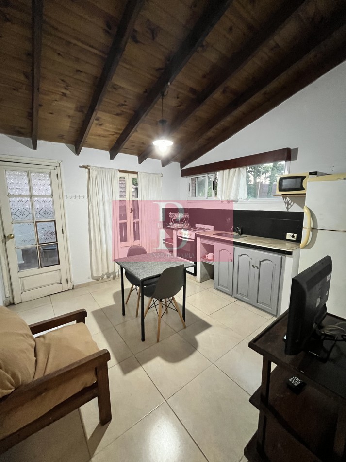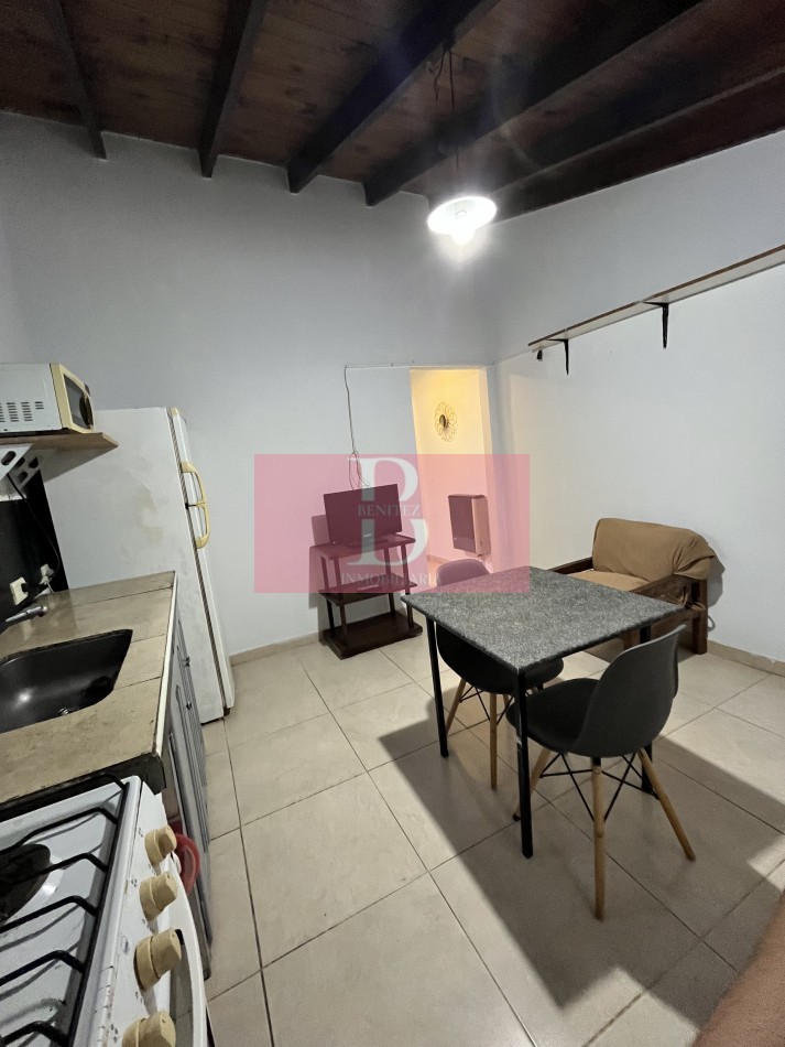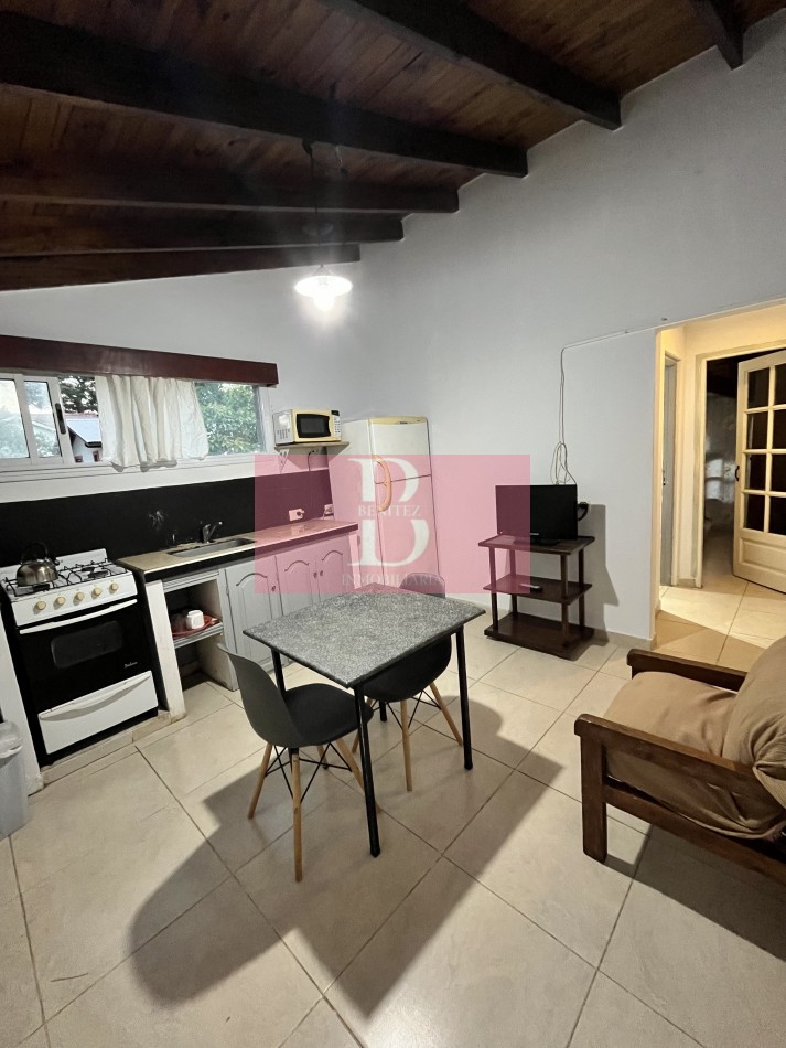Cuenta con dos ambientes que consisten en una cocina comedor equipada con cocina, heladera, mesa y sillas, un baño completo, una habitación con cama de dos plazas y un ropero empotrado para espacio de guardado.