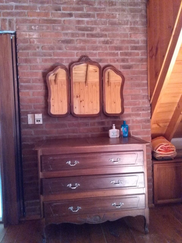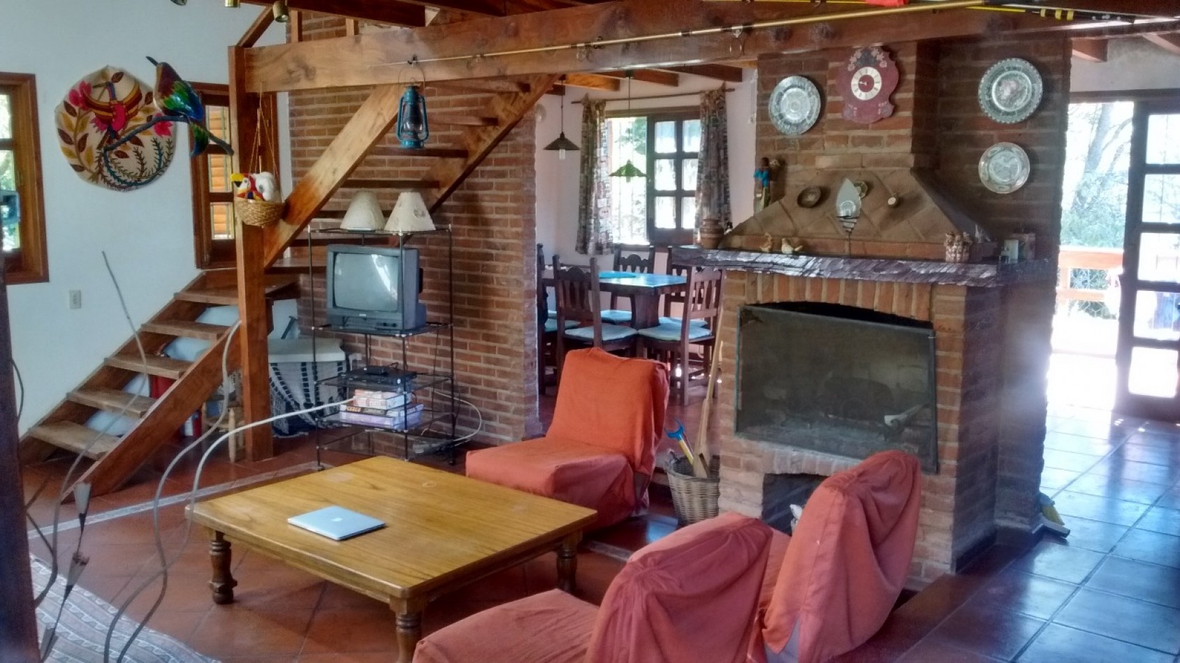Chalet refaccionado estilo cabaña, con ladrillo a la vista y techos de tejas, desarrollado en dos plantas.